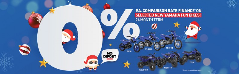 Fun Finance Yamaha is pleased to announce the 0% p.a. finance offer on selected new Fun Bikes and Fun ATVs. View Promotion